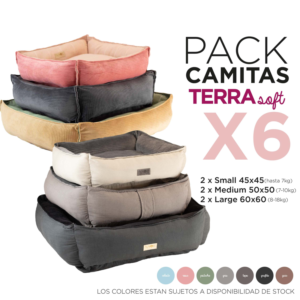 Pack ideal para mostrar la nueva línea Terra Soft: camitas livianas y suaves en tres tamaños. Perfecto para testear la línea y sumar variedad a tu local.